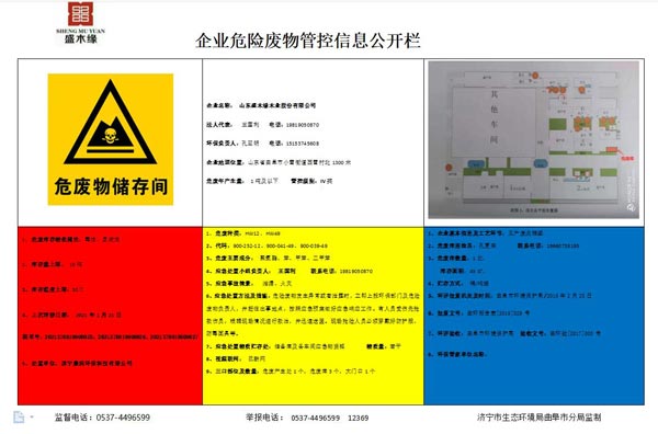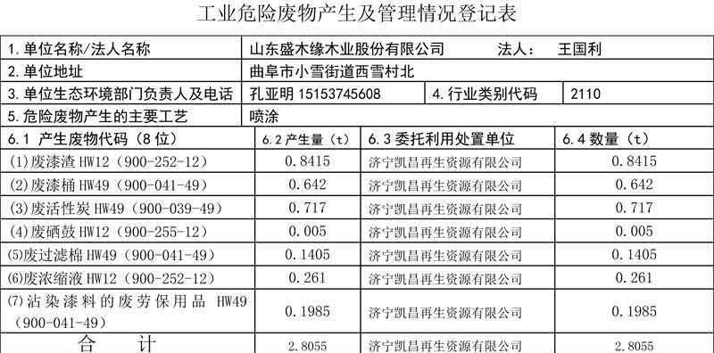 工業(yè)危險(xiǎn)廢物產(chǎn)生及管理情況登記表 1.單位名稱/法人名稱山東盛木緣木業(yè)股份有限公司 法人: 王國(guó)利2.單位地址曲阜市小雪街道西雪村北3.單位生態(tài)環(huán)境部門負(fù)責(zé)人及電話孔亞明151537456084.行業(yè)類別代碼2110